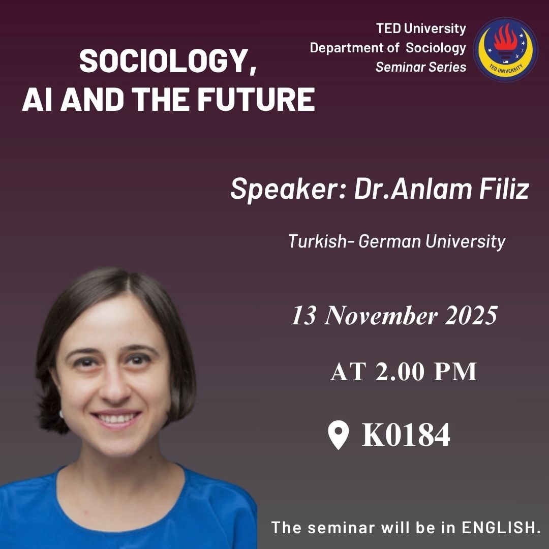 The first seminar of the TED University Department of Sociology's seminar series on "Sociology, Artificial Intelligence, and the Future", will take place on Thursday, November 13th at 2:00 PM in K0184, with the valuable participation of Dr. Anlam Filiz from the Turkish-German University. The event will discuss how dominant discourses in working life will change in the age of artificial intelligence and the sociology of the future, and the language of the event will be English.