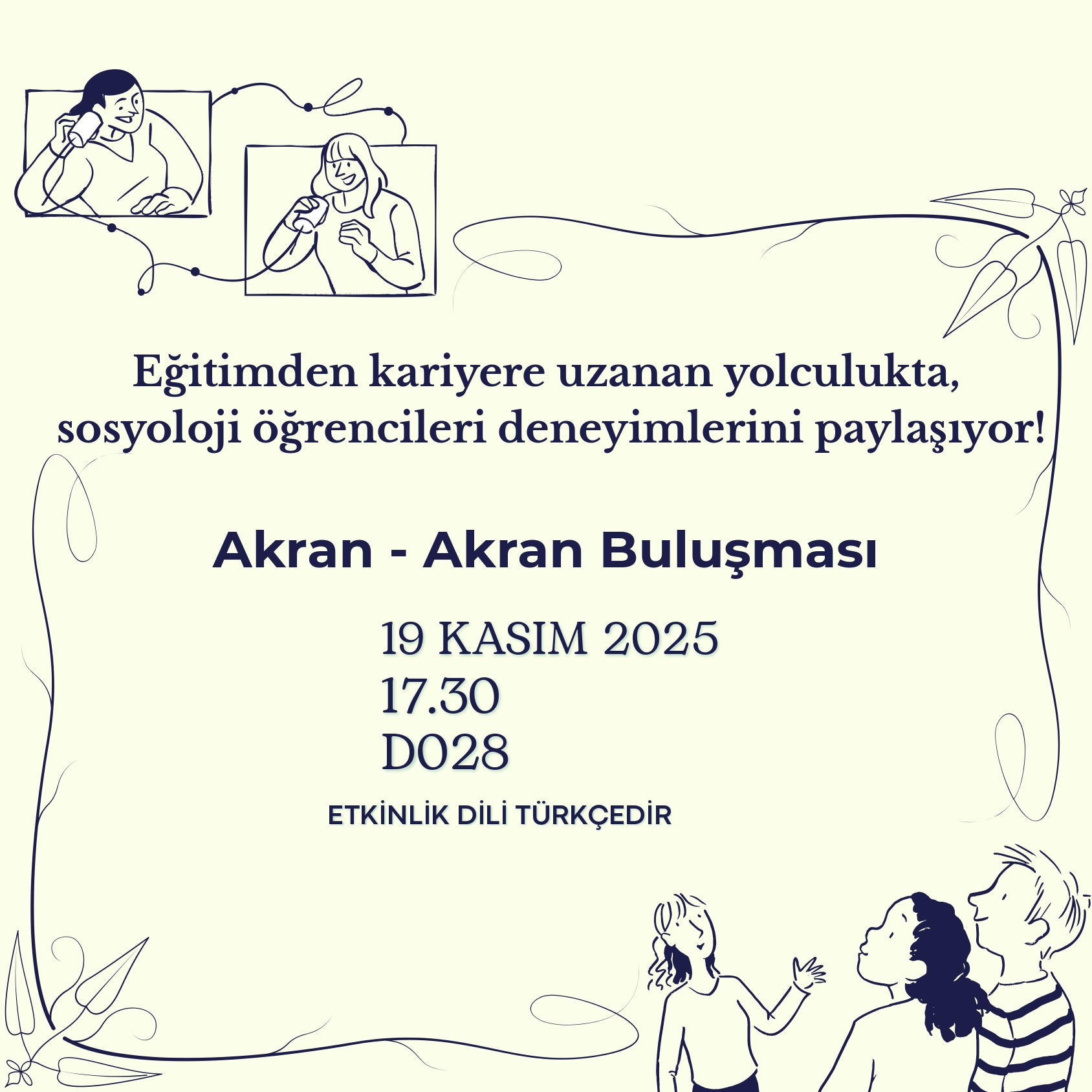 TEDÜ Sosyoloji öğrencileri, eğitimden kariyer inşasına uzanan yolculuklarına dair deneyimlerini paylaşmak üzere 19 Kasım 2025 tarihinde saat 17:30'da D028'de Akran-Akran Buluşması'nda bir araya geliyor. Etkinlik dili Türkçedir.