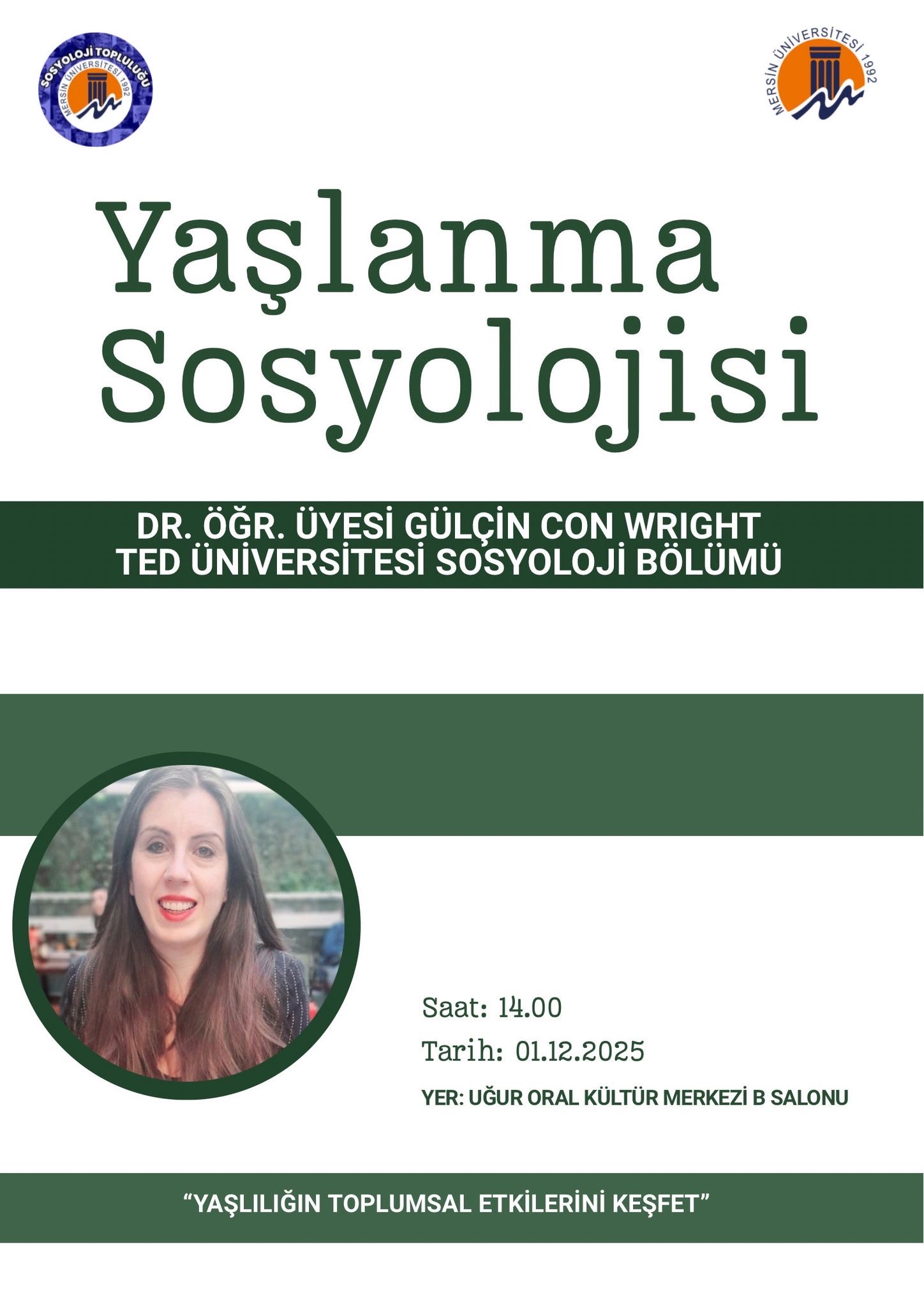 Dr. Öğr. Üyesi Gülçin Con Wright, Mersin Üniversitesi Sosyoloji Topluluğu tarafından düzenlenen Yaşlanma Sosyolojisi seminerine katılım sağlamış ve yaşlılığın toplumsal etkileri üzerine seminer vermiştir.